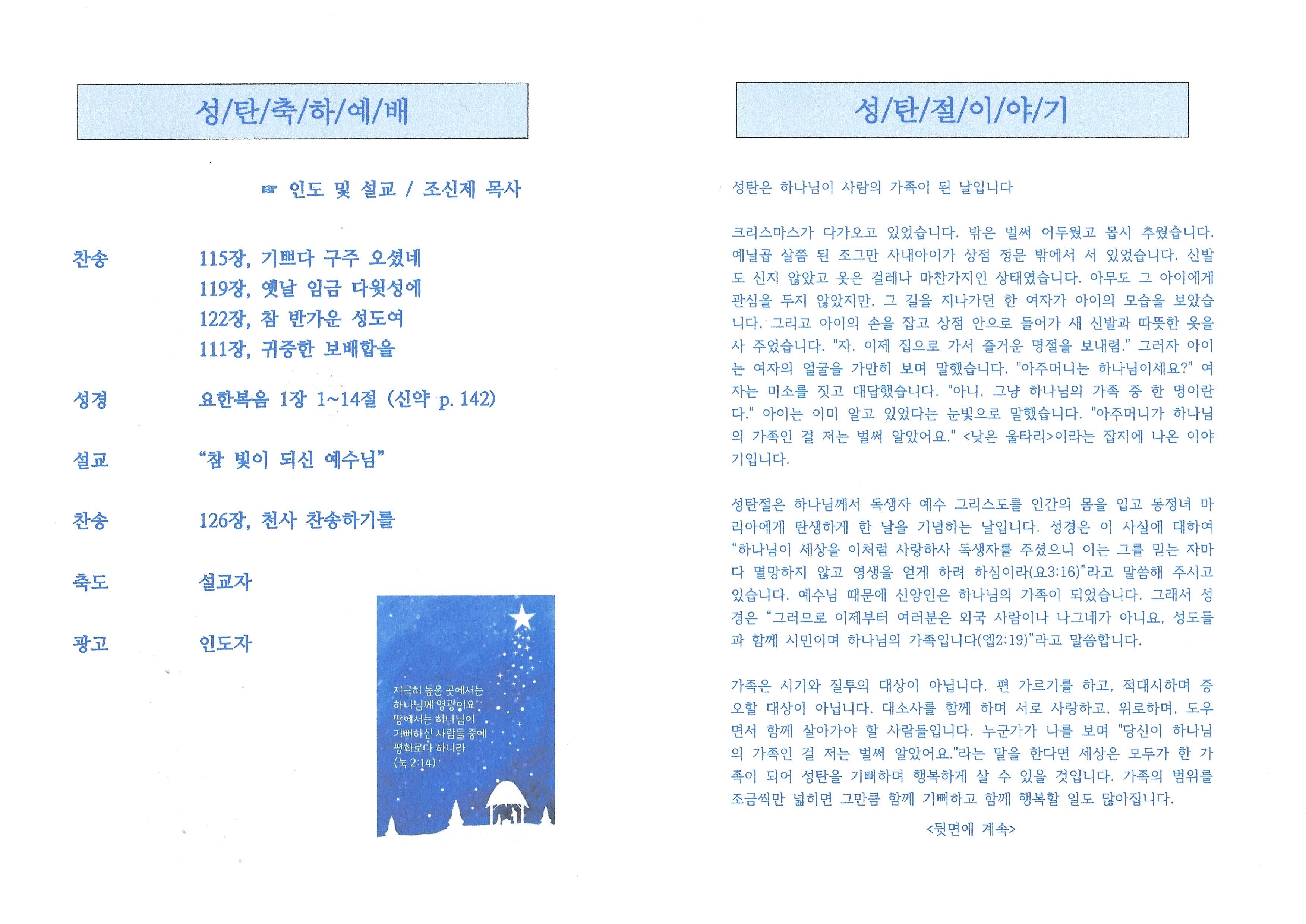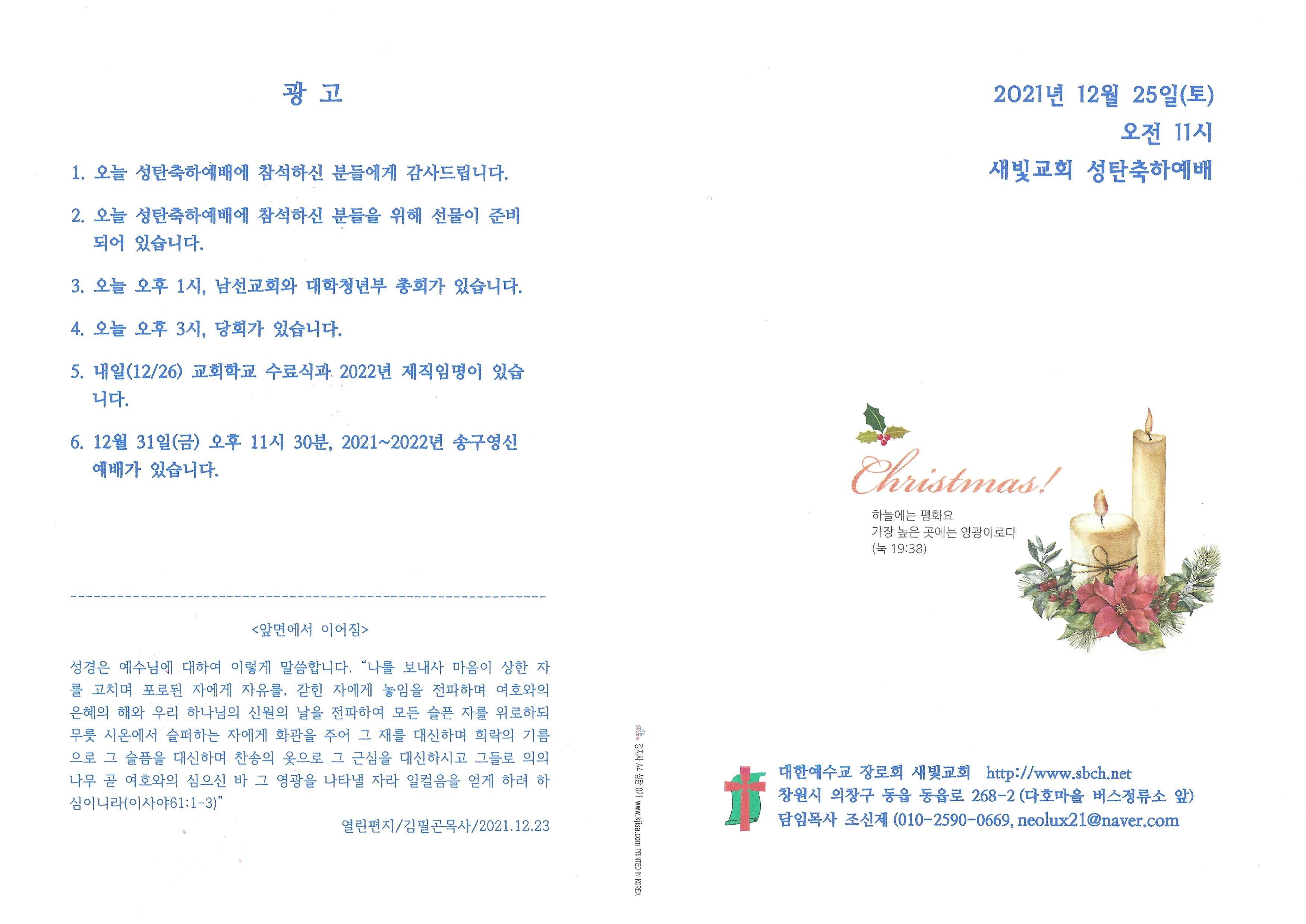 2021년 12월 25일 성탄축하예배 순서지입니다.