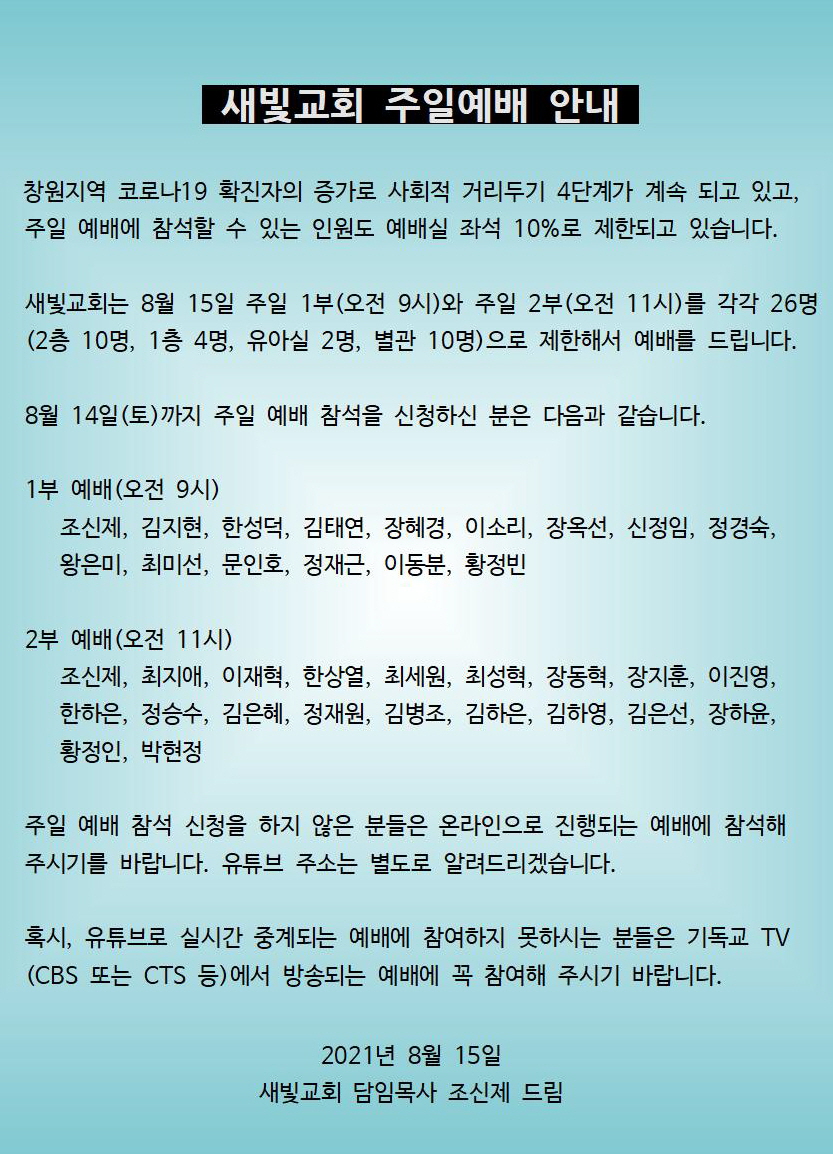 교회소식| 제 목 : 2021년 8월 15일 주일예배 안내 | 조회수 : 621 |