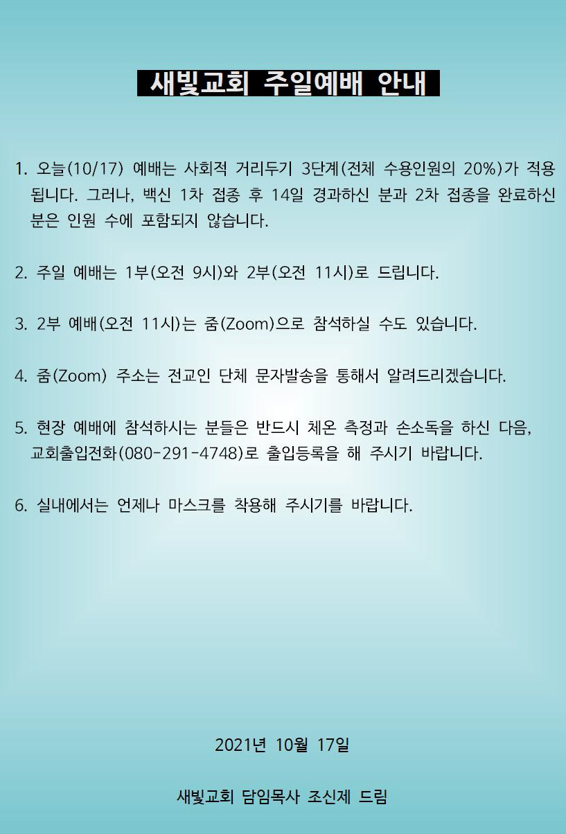 1. 오늘(10/17) 예배는 사회적 거리두기 3단계(전체 수용인원의 20%)가 적용됩니다. 그러나, 백신 1차 접종 후 14일 경과하신 분과 2차 접종을 완료하신 분은 인원 수에 포함되지 않습니다.