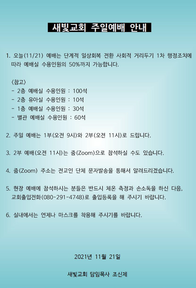 1. 오늘(11/21) 예배는 단계적 일상회복 전환 사회적 거리두기 1차 행정조치에 따라 예배실 수용인원의 50%까지 가능합니다.