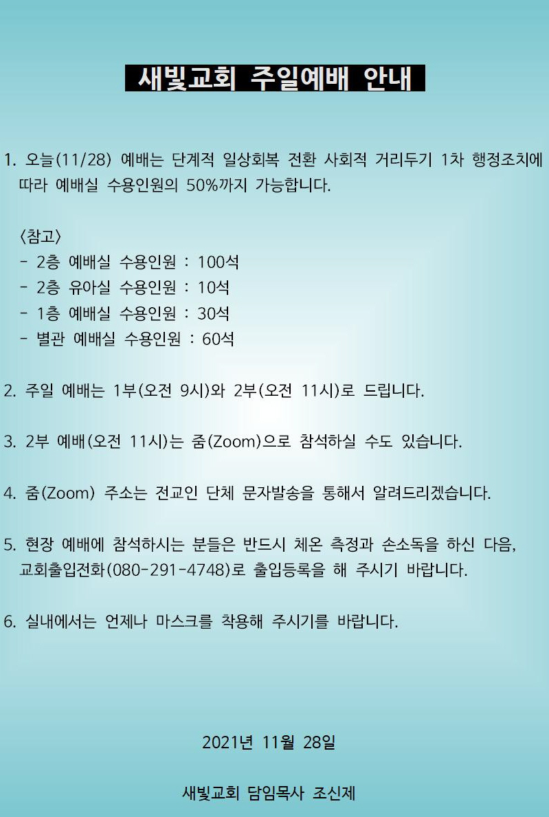 1. 오늘(11/28) 예배는 단계적 일상회복 전환 사회적 거리두기 1차 행정조치에 따라 예배실 수용인원의 50%까지 가능합니다.