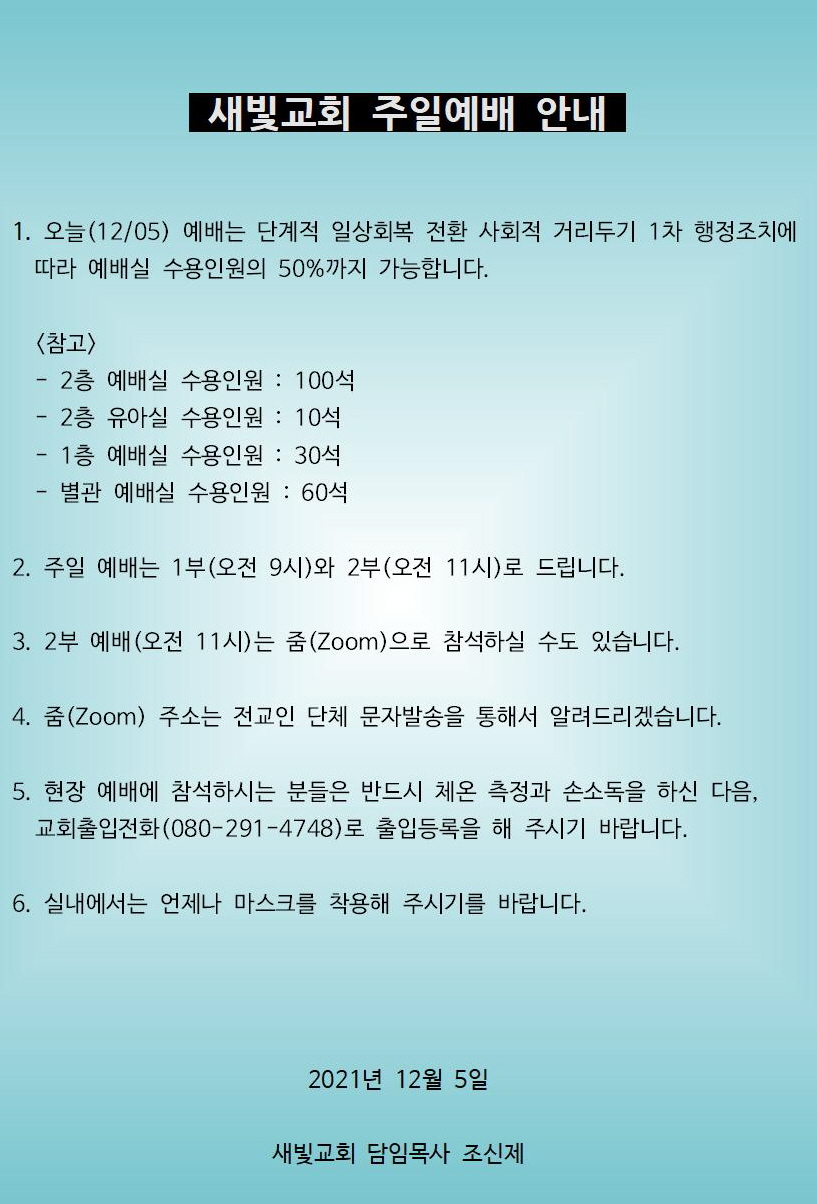 1. 오늘(12/5) 예배는 단계적 일상회복 전환 사회적 거리두기 1차 행정조치에 따라 예배실 수용인원의 50%까지 가능합니다.