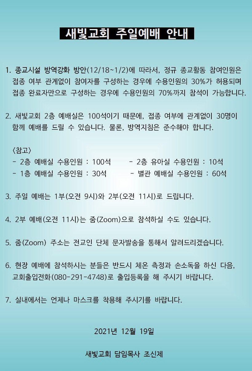 교회소식| 제 목 : 2021년 12월 19일 주일예배 안내 | 조회수 : 559 |