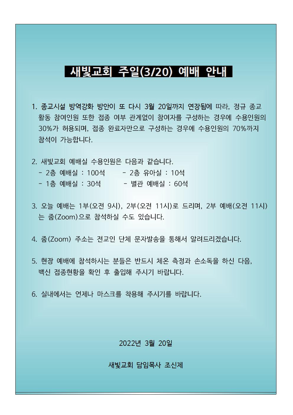 2022년 3월 20일 주일예배안내