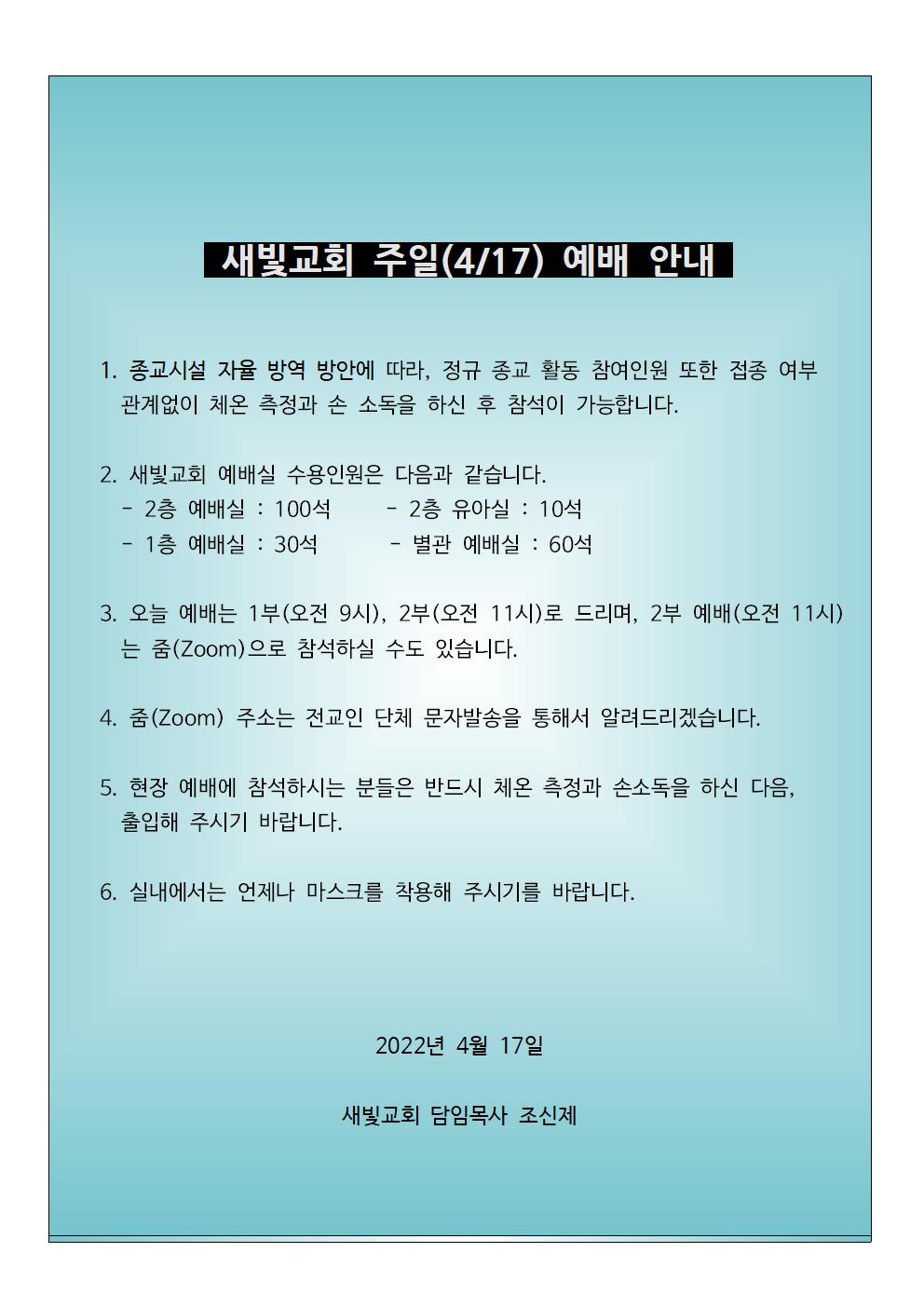 2022년 4월 17일 주일예배 안내