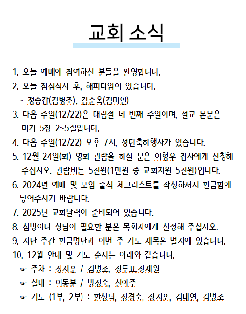 2024년 12월 22일 교회소식