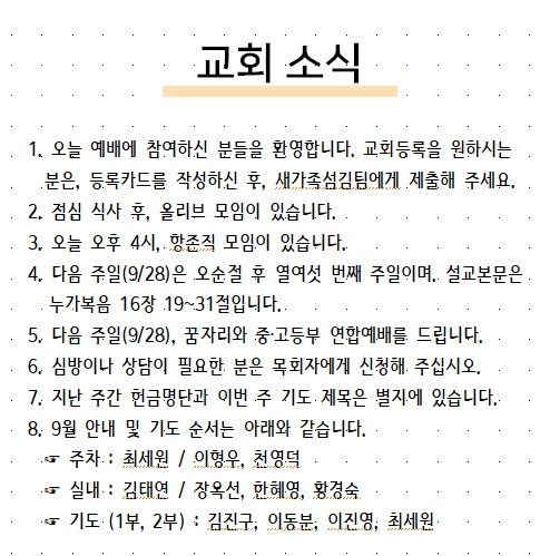 2025년 09월 14일 교회소식