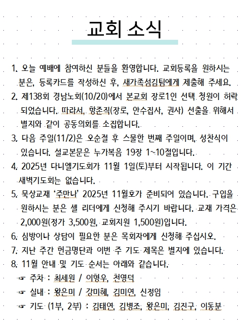 2025년 10월 26일 교회소식