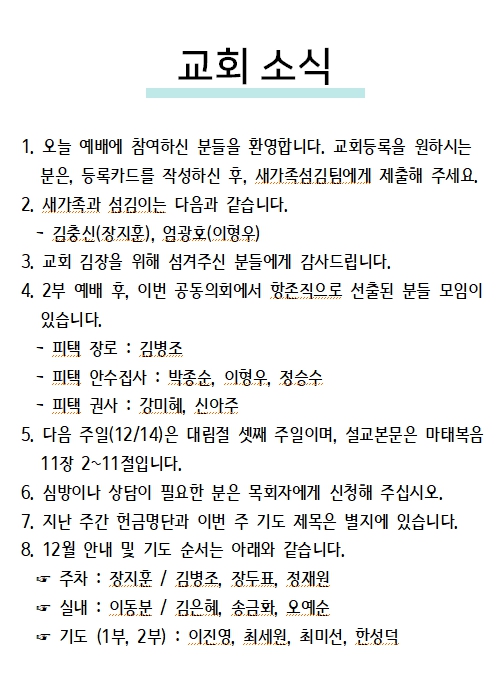 2025년 12월 14일 교회소식