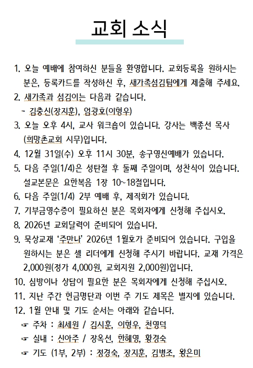 2025년 12월 28일 교회소식