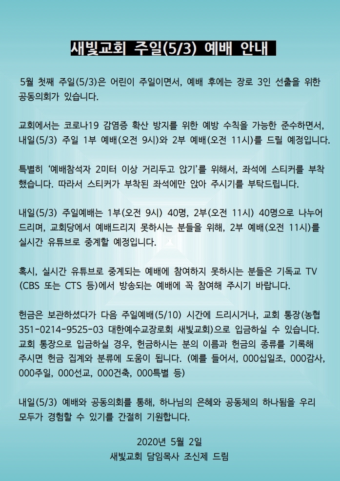 2020년 5월 3일 주일예배 안내