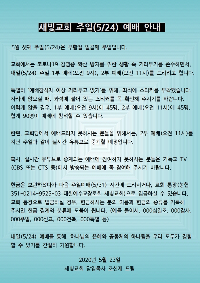 헌금은 보관하셨다가 다음 주일예배(5/31) 시간에 드리시거나, 교회 통장(농협 351-0214-9525-03 대한예수교장로회 새빛교회)으로 입금하실 수 있습니다. 교회 통장으로 입금하실 경우, 헌금하시는 분의 이름과 헌금의 종류를 기록해 주시면 헌금 집계와 분류에 도움이 됩니다. (예를 들어서, 000십일조, 000감사, 000주일, 000선교, 000건축, 000특별 등)