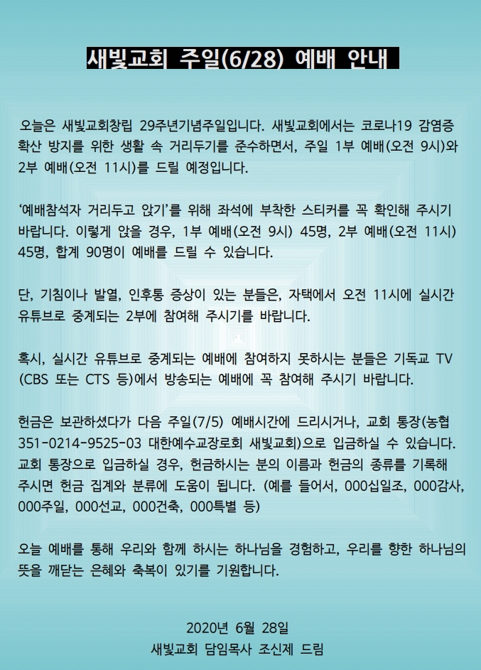 새빛교회 주일(6/28) 예배 안내