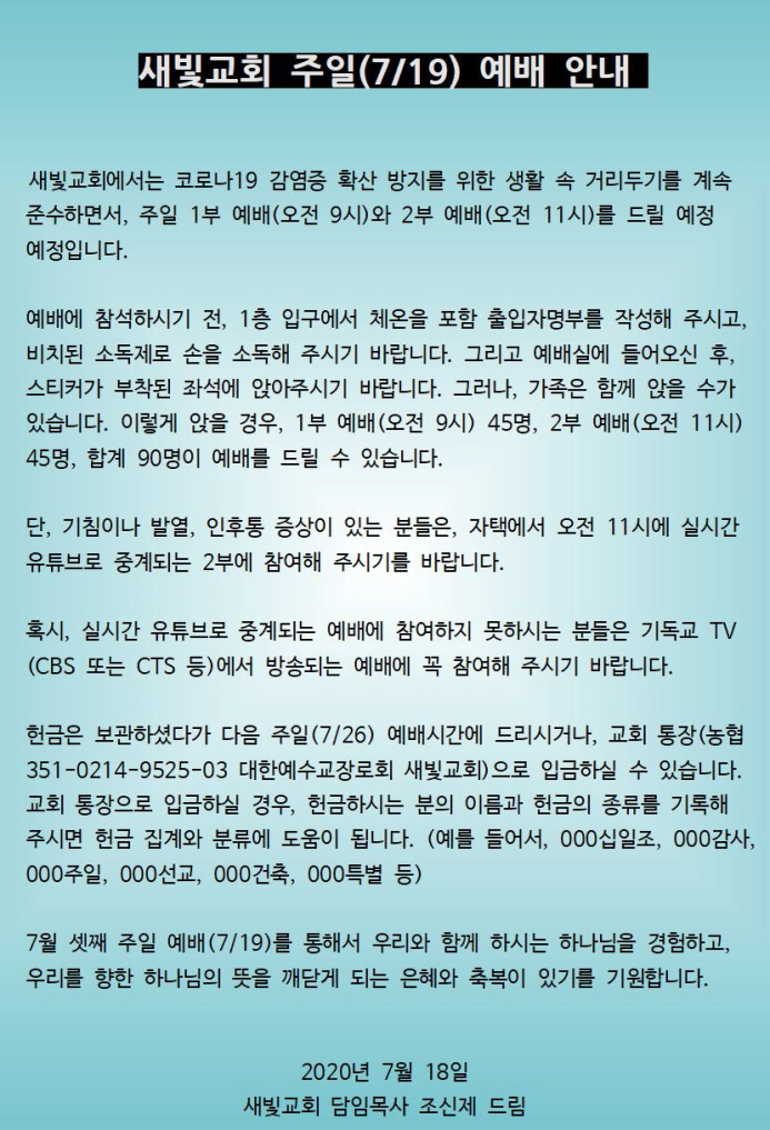 헌금은 보관하셨다가 다음 주일(7/26)에 드리시거나, 교회 통장(농협 351-0214-9525-03 대한예수교장로회 새빛교회)으로 입금하실 수 있습니다.