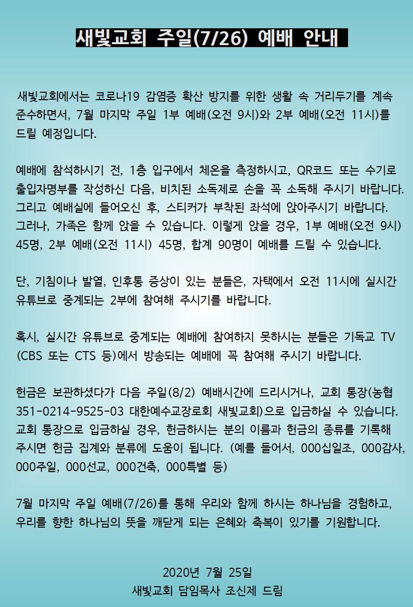 교회소식| 제 목 : 2020년 7월 26일 주일예배안내 | 조회수 : 835 |