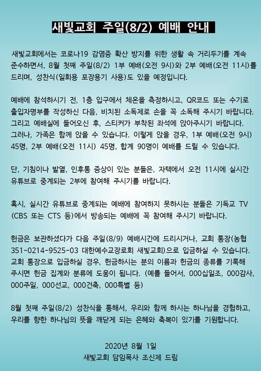 교회소식| 제 목 : 2020년 8월 2일 주일예배안내 | 조회수 : 877 |