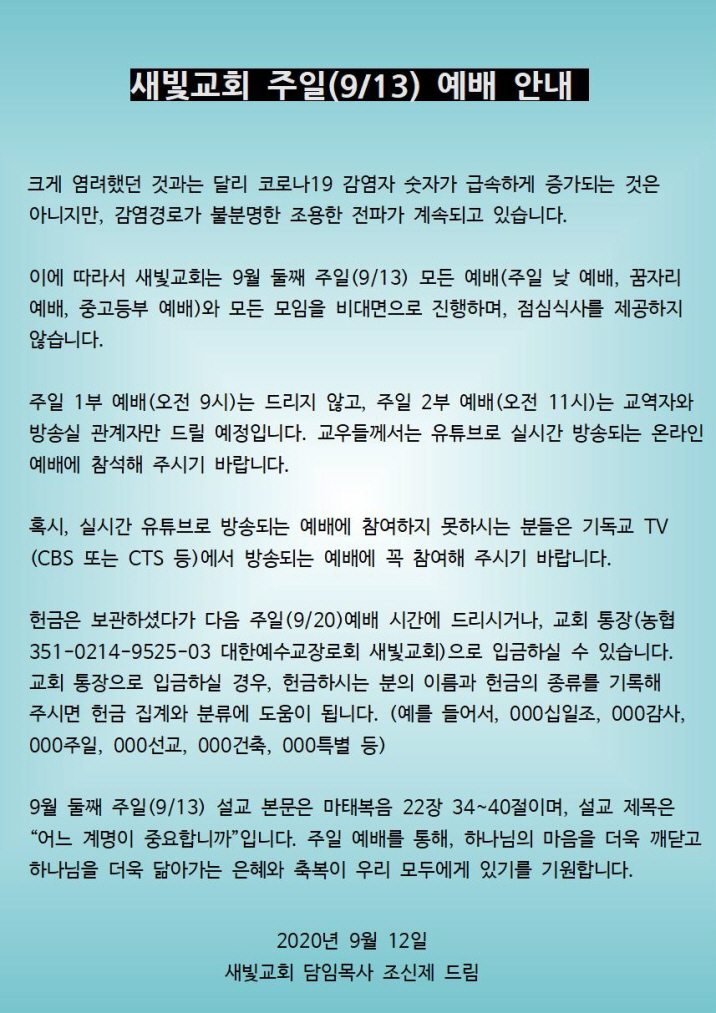2020년 9월 13일 주일예배 안내