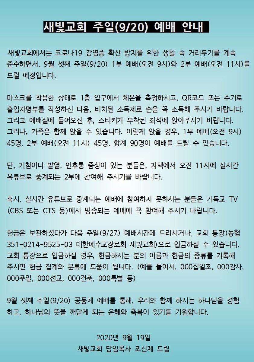따라서, 새빛교회는 내일(9/20) 예배를 1부(오전 9시, 최대 45명)와 2부(오전 11시, 최대 45명)로 드릴 예정입니다. 그러나 점심식사는 제공되지 않습니다.