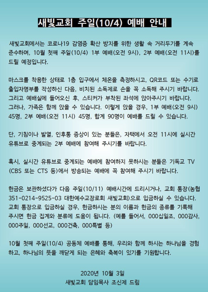내일(10/4) 새빛교회는 예배를 1부(오전 9시, 최대 45명)와 2부(오전 11시, 최대 45명)로 나누어 드리고, 정부의 방침에 따라서 점심식사를 제공하지 않습니다.