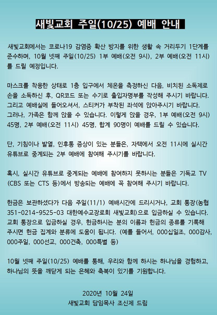 따라서, 내일(10/25) 예배는 종전과 같이 1부(오전 9시, 최대 45명)와 2부(오전 11시, 최대 45명)로 나누어 드리고, 점심식사는 지자체의 권고를 존중하여 제공하지 않습니다.