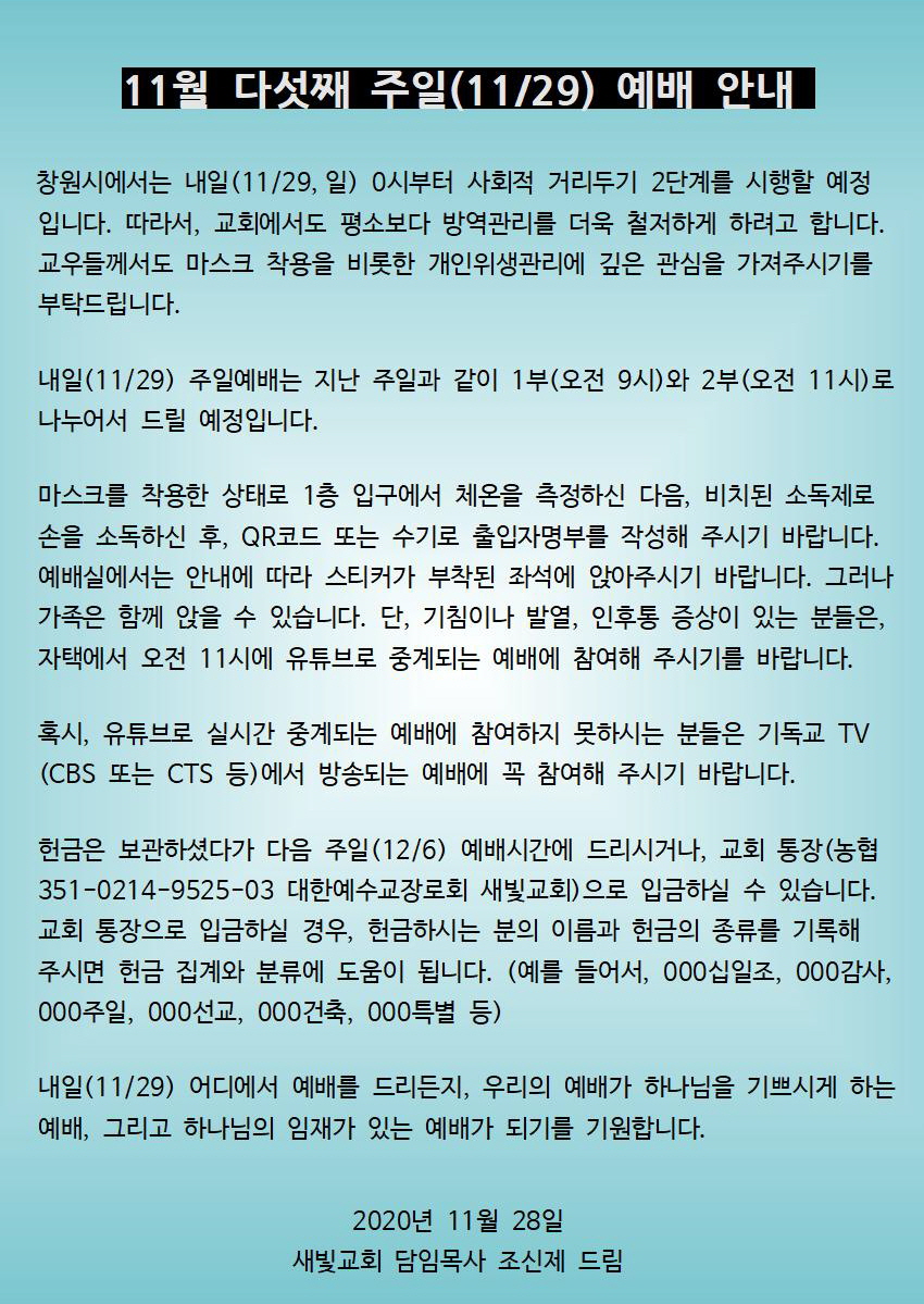 교회소식| 제 목 : 2020년 11월 29일 주일예배 안내 | 조회수 : 681 |