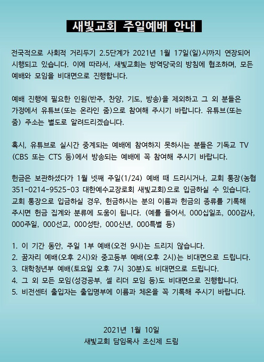 전국적으로 사회적 거리두기 2.5단계가 2021년 1월 17일(일)시까지 연장되어 시행되고 있습니다. 이에 따라서, 새빛교회는 방역당국의 방침에 협조하며, 모든 예배와 모임을 비대면으로 진행합니다.