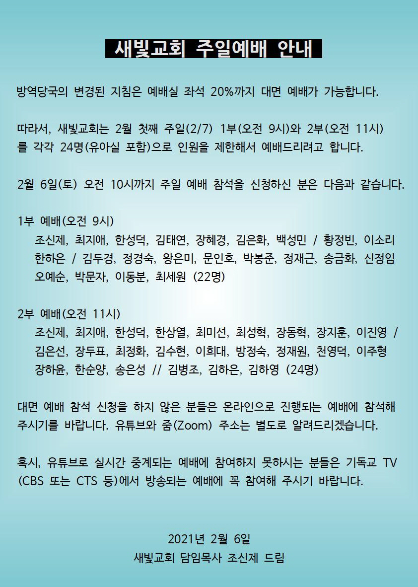 새빛교회는 2월 첫째 주일(2/7) 1부(오전 9시)와 2부(오전 11시)를 각각 24명(유아실 포함)으로 인원을 제한해서 예배드리려고 합니다.