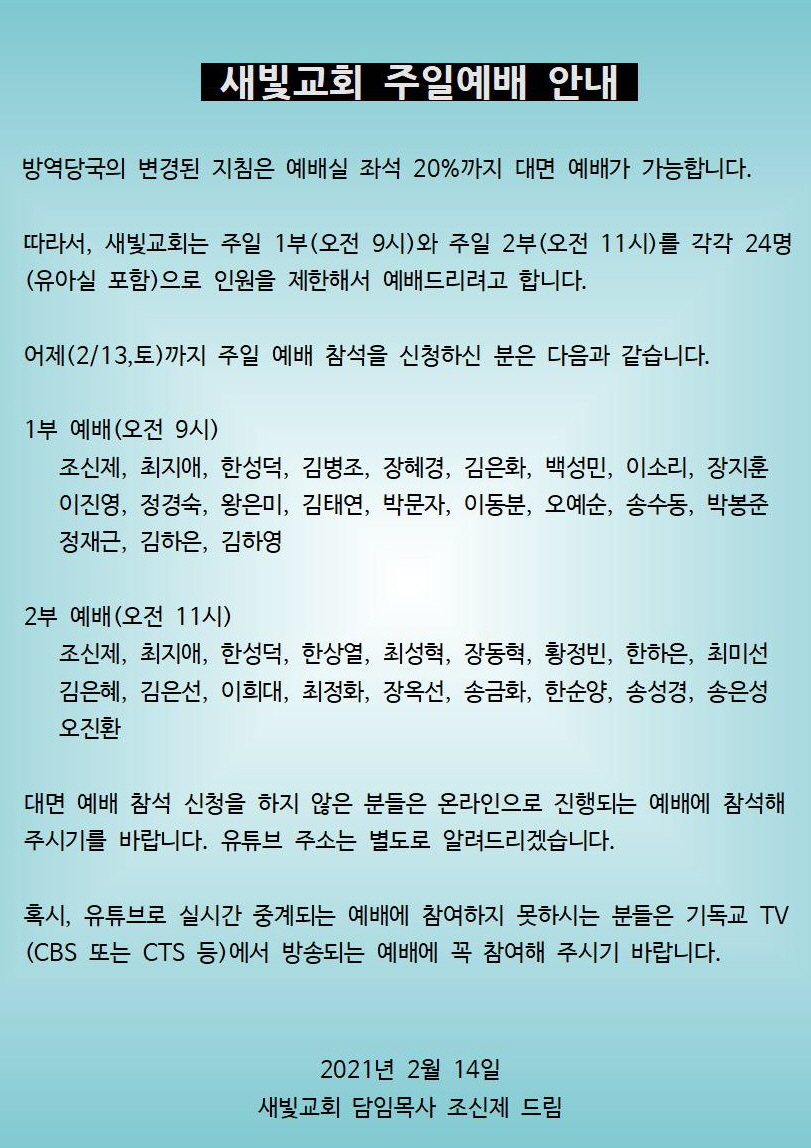 교회소식| 제 목 : 2021년 2월 14일 주일예배 안내 | 조회수 : 732 |