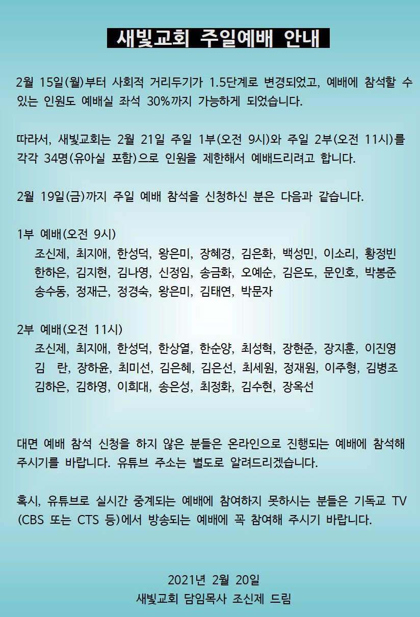 따라서, 새빛교회는 2월 21일 주일 1부(오전 9시)와 주일 2부(오전 11시)를 각각 34명(유아실 포함)으로 인원을 제한해서 예배드리려고 합니다.