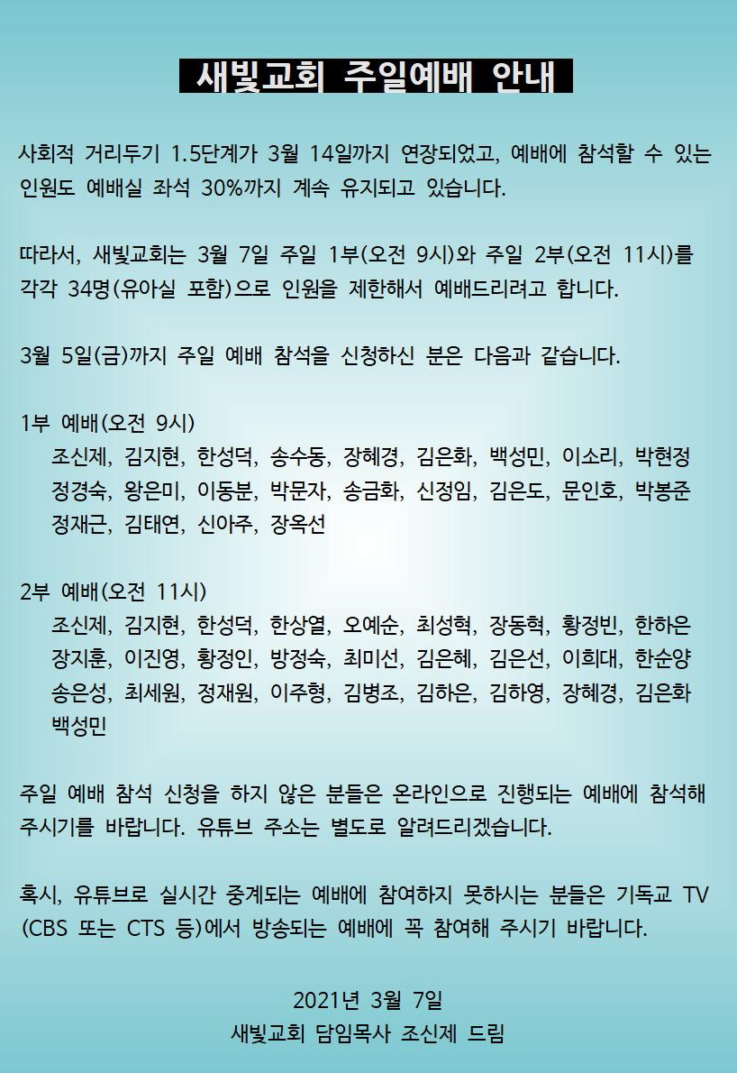 따라서, 새빛교회는 3월 7일 주일 1부(오전 9시)와 주일 2부(오전 11시)를 각각 34명(유아실 포함)으로 인원을 제한해서 예배드리려고 합니다.