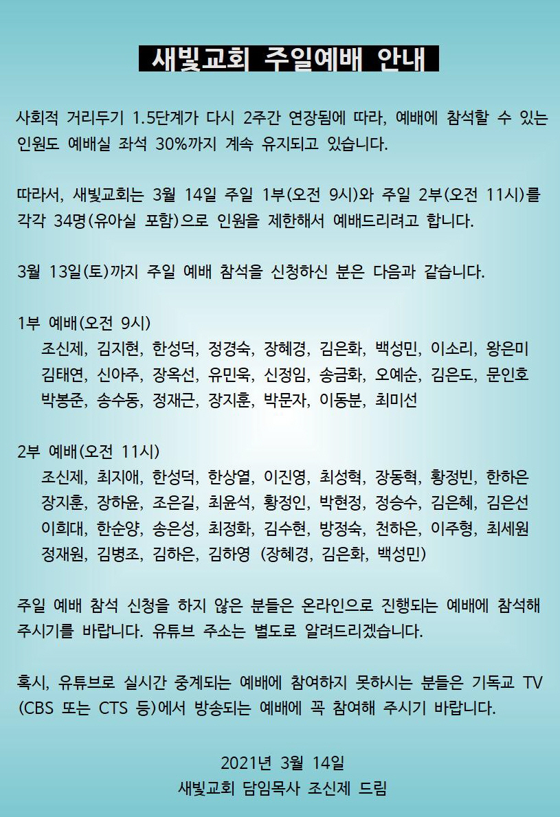 따라서, 새빛교회는 3월 14일 주일 1부(오전 9시)와 주일 2부(오전 11시)를 각각 34명(유아실 포함)으로 인원을 제한해서 예배드리려고 합니다.