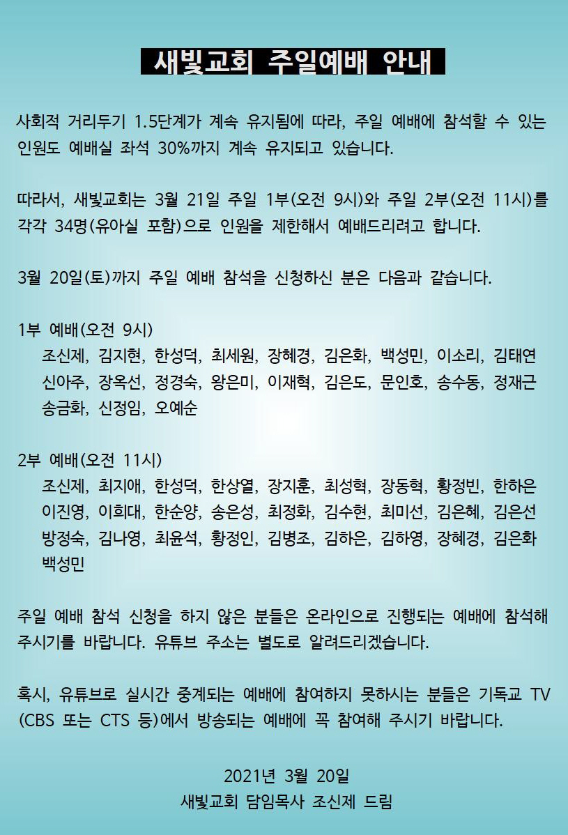 따라서, 새빛교회는 3월 21일 주일 1부(오전 9시)와 주일 2부(오전 11시)를 각각 34명(유아실 포함)으로 인원을 제한해서 예배드리려고 합니다.