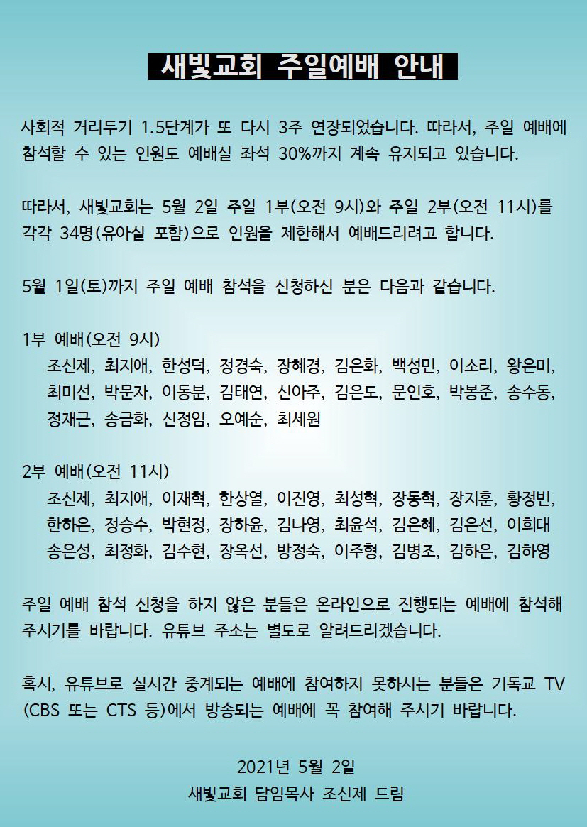 따라서, 새빛교회는 5월 2일 주일 1부(오전 9시)와 주일 2부(오전 11시)를 각각 34명(유아실 포함)으로 인원을 제한해서 예배드리려고 합니다.