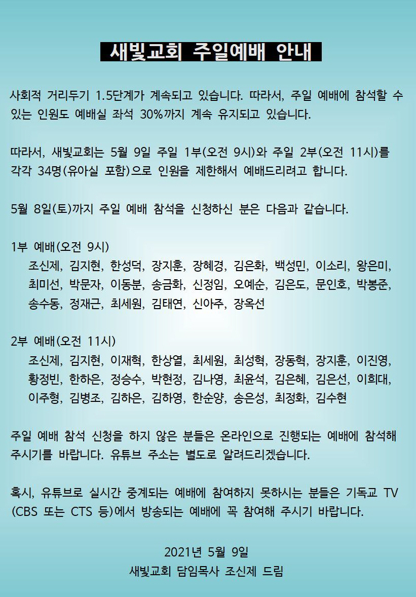 따라서, 새빛교회는 5월 9일 주일 1부(오전 9시)와 주일 2부(오전 11시)를 각각 34명(유아실 포함)으로 인원을 제한해서 예배드리려고 합니다.