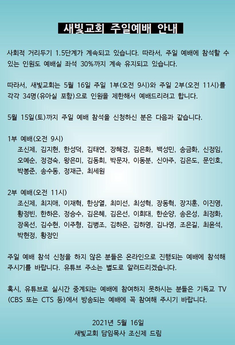 5월 15일(토)까지 주일 예배 참석을 신청하신 분은 다음과 같습니다.