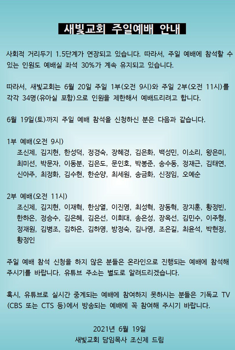 주일 예배 참석 신청을 하지 않은 분들은 온라인으로 진행되는 예배에 참석해 주시기를 바랍니다. 유튜브 주소는 별도로 알려드리겠습니다.