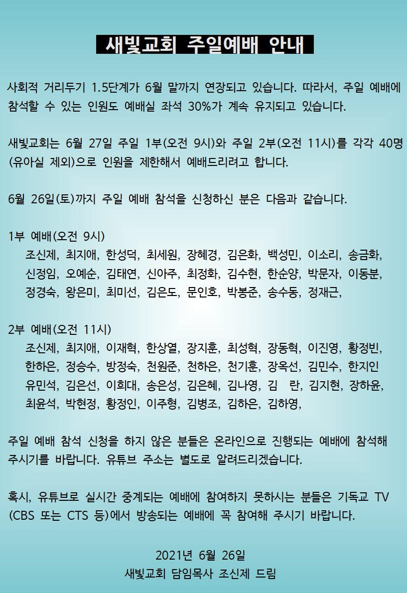 6월 26일(토)까지 주일 예배 참석을 신청하신 분은 다음과 같습니다.