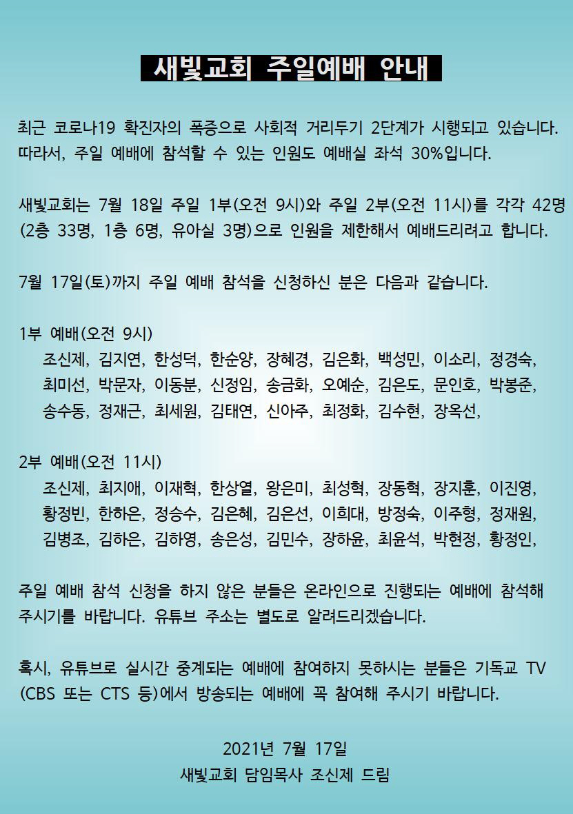 7월 17일(토)까지 주일 예배 참석을 신청하신 분은 다음과 같습니다.