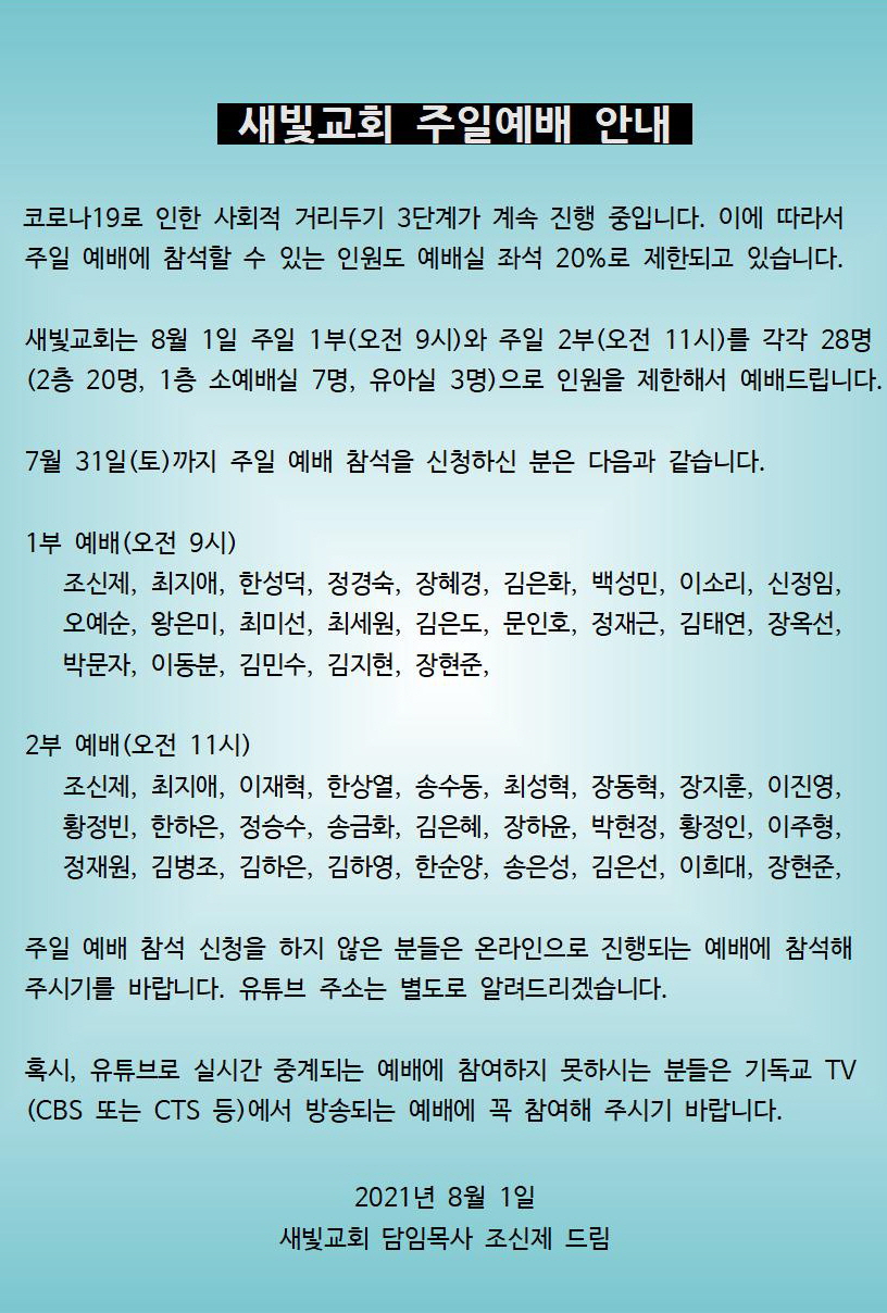 교회소식| 제 목 : 2021년 8월 1일 주일예배 안내 | 조회수 : 601 |